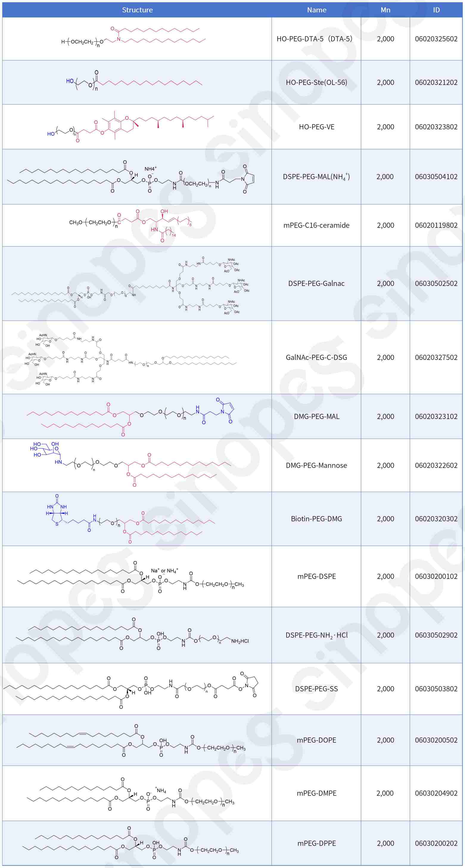Leveraging profound technical expertise, SINOPEG has developed a variety of novel PEG-lipid structures, providing more high-quality options for global pharmaceutical R&D. The company recently has multiple novel lipid structures readily available to meet different R&D and production needs, including: DSPE-PEG-MAL, GaINAC-PEG-C-DSG, OL-56 (HO-PEG-Ste), mPEG-C16-ceramide, mPEG-DHE-, Biotin-PEG-DMG, DMG-PEG-MAL, HO-PEG-VE, DMG-PEG-Mannose, DSPE-PEG-Galnac, mPEG-DPPE(14:0 PEG2000), mPEG-DMPE(16:0 PEG2000 PE-2K), mPEG-DOPE(18:1 PEG2000 PE-2K).